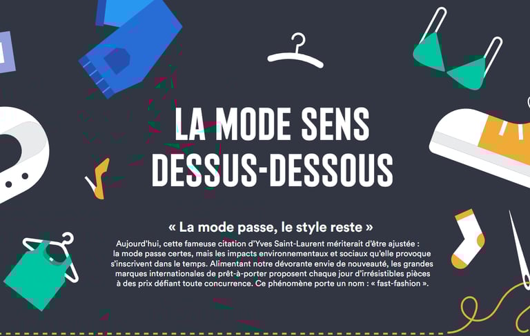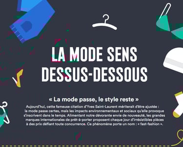 Cette infographie vous explique quels sont les impacts environnementaux liés à la mode et vous dévoile les astuces pour un look plus respectueux de l'environnement. Elle fait le point sur les différents matières premières qui composent nos vêtements, leur fabrication, leur transport, leur utilisation et leur entretien, jusqu'à leur fin de vie tout en donnant les clés pour une consommation plus responsable, du choix des labels au recyclage. (cliquer sur l'image pour en savoir +)