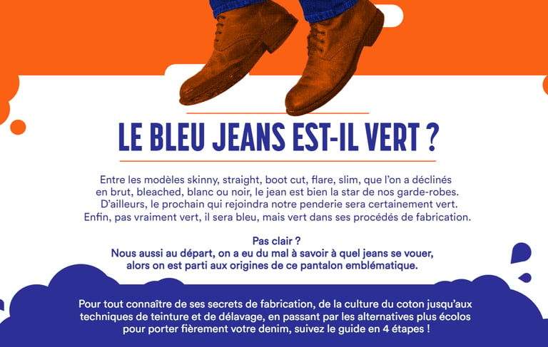 Enfin, pas vraiment vert, il sera bleu, mais vert dans ses procédés de fabrication.Pas clair ?Nous aussi au départ, on a eu du mal à savoir à quel jeans se vouer,alors on est parti aux origines de ce pantalon emblématique.Entre les modèles skinny, straight, boot cut, flare, slim, que l’on a déclinéspour porter fièrement votre denim, suivez le guide en 4 étapes ! (cliquer sur l'image pour en savoir +)